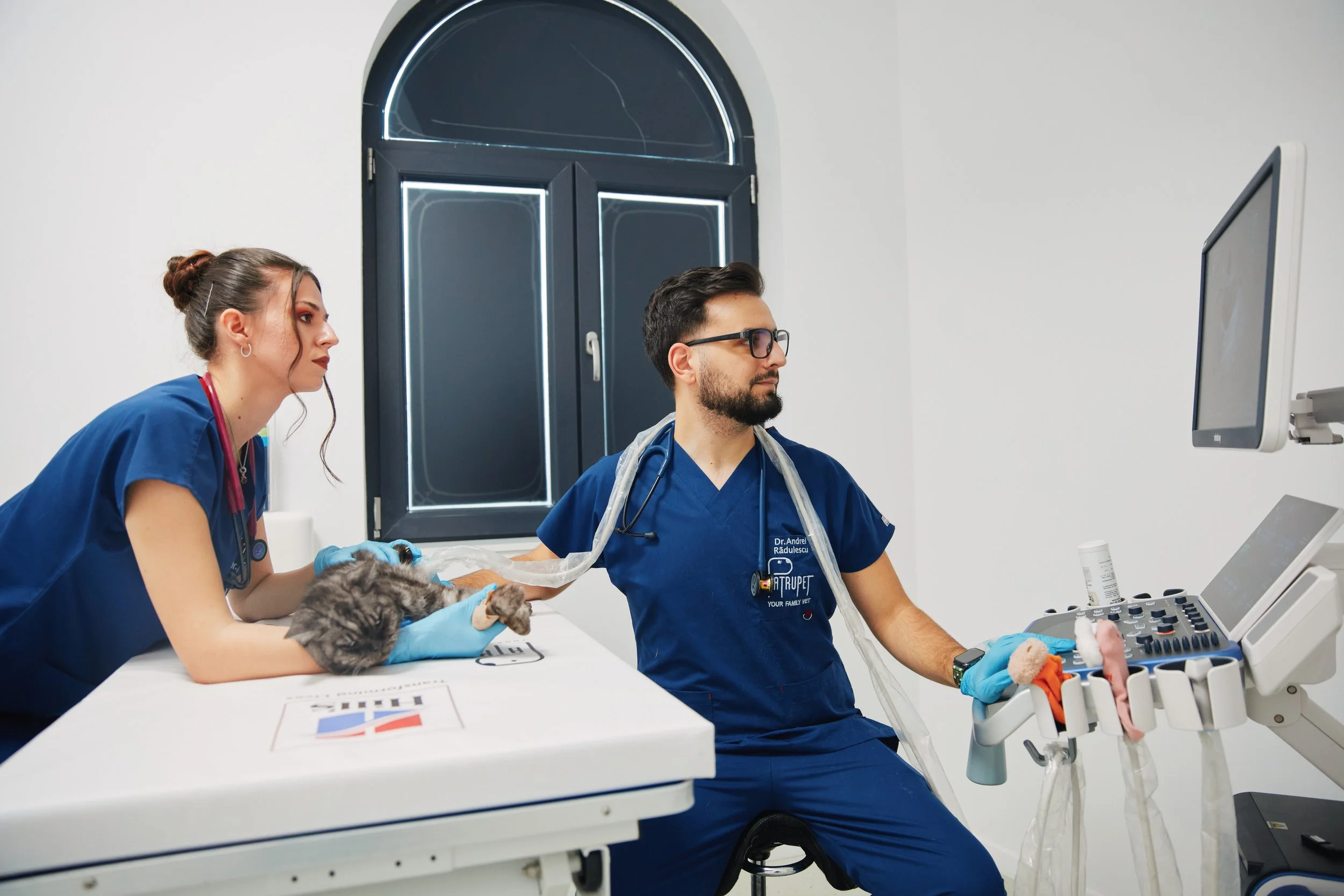 Totul începe cu o consultație completă. Medicul discută cu proprietarul despre simptomele observate, durata lor și contextul în care au apărut. O tuse ocazională după efort are o semnificație diferită față de o respirație grea apărută în repaus. În timpul examinării clinice, medicul ascultă inima și plămânii cu stetoscopul, verifică mucoasele, frecvența respiratorie și poziția corpului în timpul respirației. La pisici, de exemplu, poziția ghemuită cu gâtul întins poate sugera un disconfort respirator. La câini, intoleranța la efort sau oboseala rapidă ridică suspiciuni care merită investigate. Această etapă ajută la stabilirea unui tablou general. Dacă semnele indică o problemă localizată în torace, medicul ia în calcul investigațiile imagistice potrivite.
